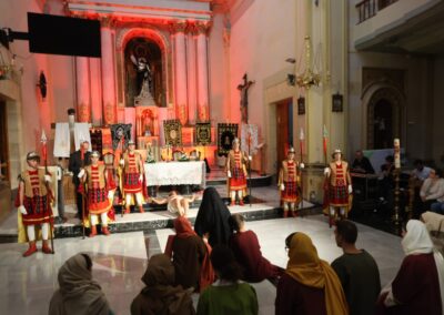 Por la tarde prosiguió el encuentro en la Iglesia de San Vicente Ferrer con un grupo de jóvenes y niños del Colegio Santa Faz y de la parroquia, que representaron y cantaron varias escenas de la Pasión, dirigidos por el párroco Miguel Ángel Cerezo. A continuación, se ofició una Misa de Acción de Gracias por el XXV Aniversario de la Junta Diocesana, en la que se realizó un agradecimiento a los tres primeros presidentes de esta entidad, desde que se creó en 1998. La actual presidenta, Beatriz Gandulla entregó unos detalles a Francisco Polo Candela, Vicente Mora Culiáñez y José Vicente Más Zaplana (que no ha podido acudir al acto y en su lugar recogió el obsequio el anterior secretario de la Junta Diocesana, José Vicente Gómez Blasco).