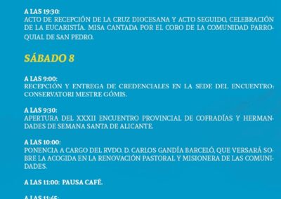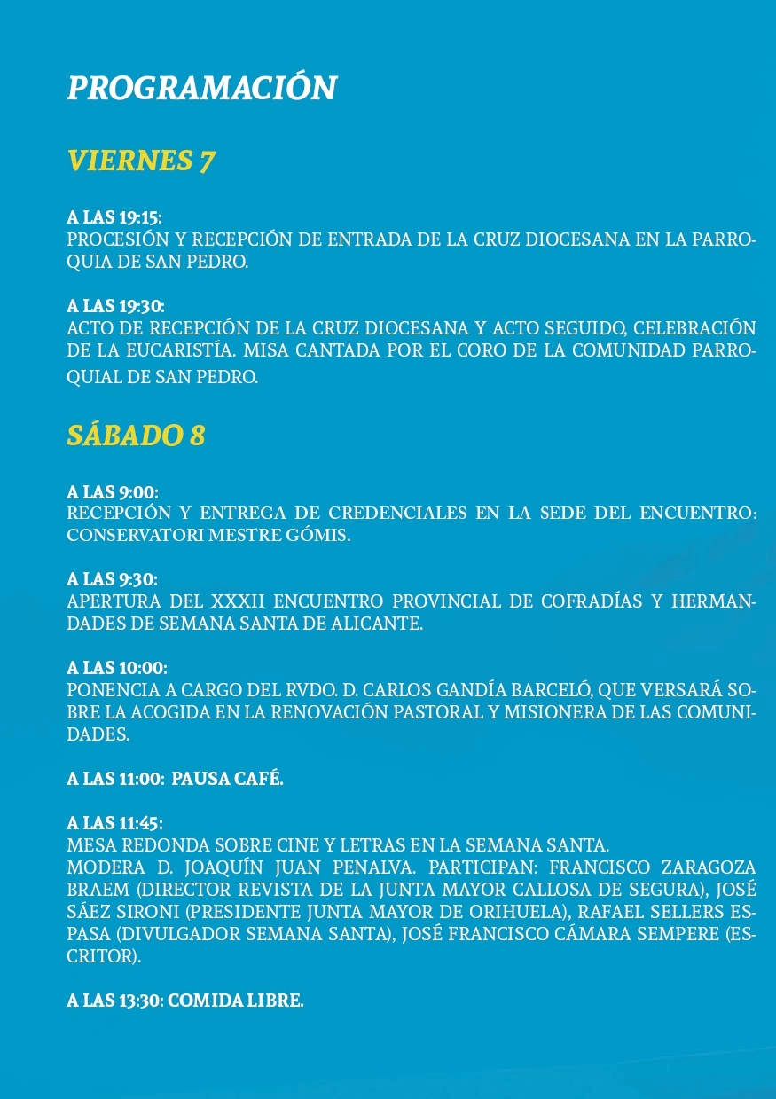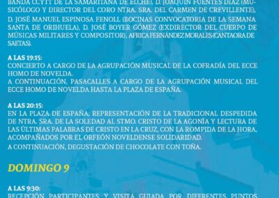 El sábado 8 se desarrollará la apertura oficial del encuentro, en el auditorio del Conservatorio de Música ‘Mestre Gomis’, junto a diversas ponencias y mesas redondas sobre la renovación pastoral, la música y la literatura en la Semana Santa, además de actividades culturales, un concierto a cargo de la Agrupación Musical del Ecce Homo de Novelda y la tradicional representación de la Despedida de la Virgen de la Soledad y el Cristo de la Agonía en la Plaza de España, que culminará con una degustación popular de chocolate con toña.